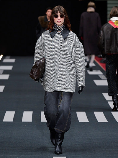 Airborne interprets rigid silhouettes through a softened, expressive lens. Aviator-inspired jackets, uniform shirts, distressed leather, and rigid denim form the backbone of the wardrobe. Outerwear plays a central role - puffed jackets, structured coats, and oversized aviator silhouettes dominate, evoking protection, strength, and adventure. These utilitarian foundations are offset by fluid dresses, lace trims, scarf-inspired details, and lightweight fabrics that introduce movement and delicacy.