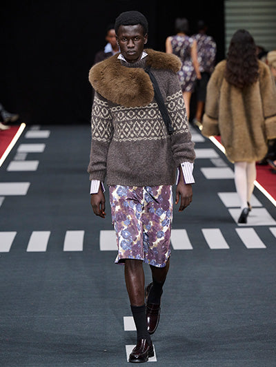 Delicate floral prints reference moments of off-duty elegance, while checks, oily dot patterns, and workshop-inspired motifs nod to uniforms and mechanical environments. The colour palette blends earthy neutrals and worn workwear tones with deep reds and muted prints.